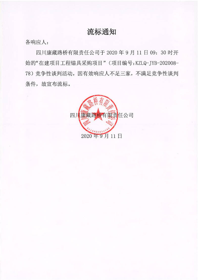 四川康藏路橋有限責任公司在建項目工程錨具采購競爭性談判流標通知