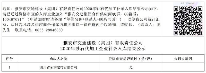 雅安市交通建設(shè)(集團)有限責(zé)任公司2020年砂石代加工企業(yè)補錄入庫結(jié)果公示