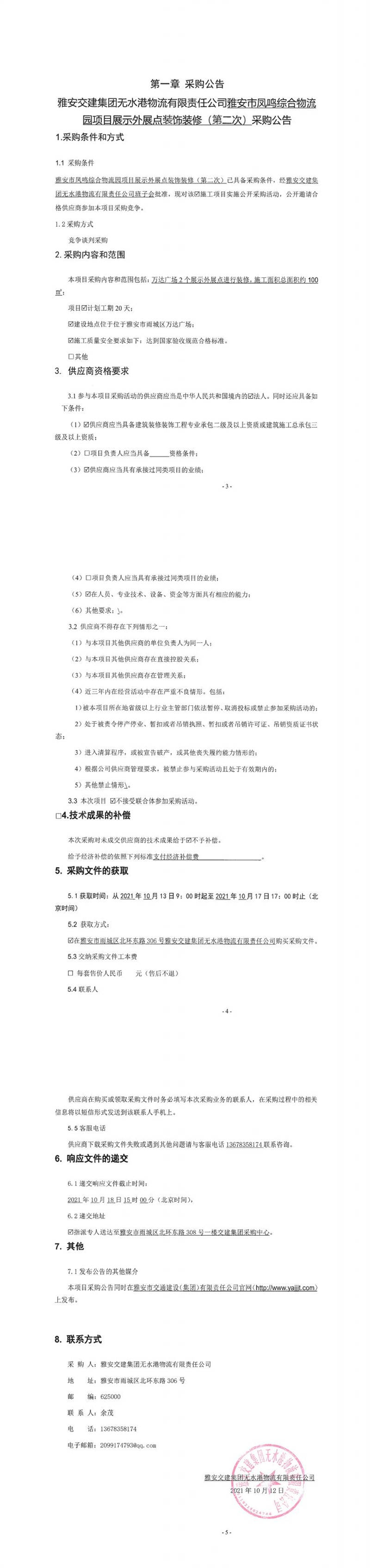 雅安交建集團(tuán)無水港物流有限責(zé)任公司雅安市鳳鳴綜合物流園項目展示外展點裝飾裝修(第二次)采購公告
