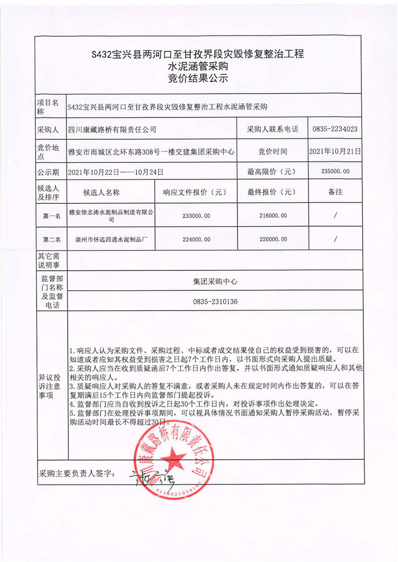 四川康藏路橋有限責任公司S432線寶興縣兩河口至甘孜界段災毀修復整治工程水泥涵管采購競價結(jié)果公示