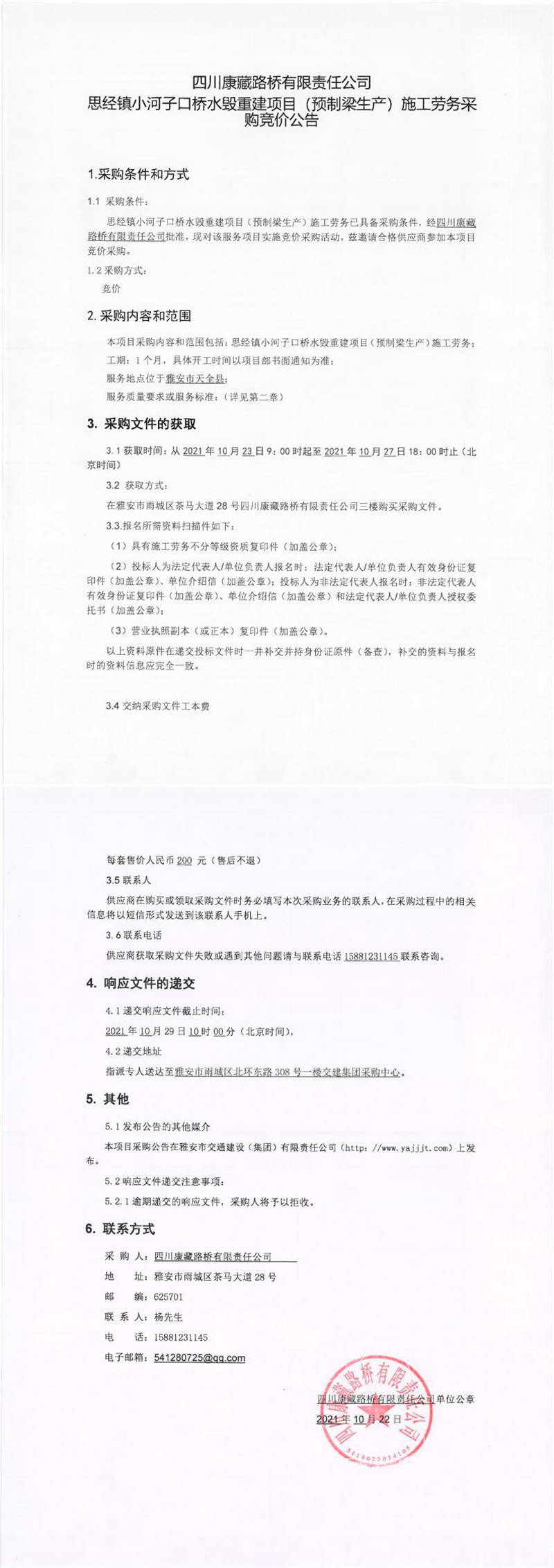 四川康藏路橋有限責(zé)任公司思經(jīng)鎮(zhèn)小河子口橋水毀重建項(xiàng)目(預(yù)制梁生產(chǎn))施工勞務(wù)采購(gòu)競(jìng)價(jià)公告