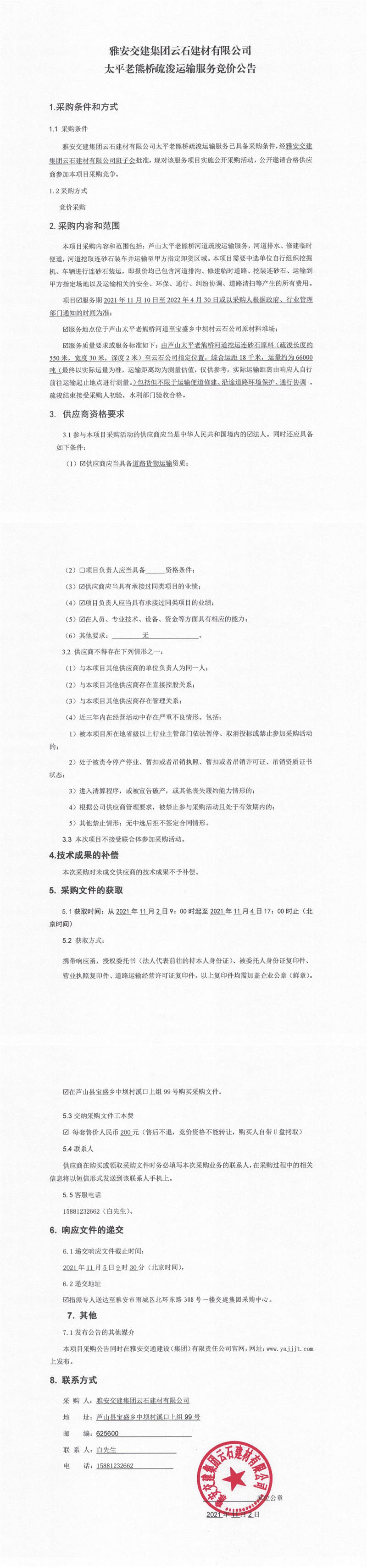 雅安交建集團(tuán)云石建材有限公司太平老熊橋疏浚運(yùn)輸服務(wù)競(jìng)價(jià)公告