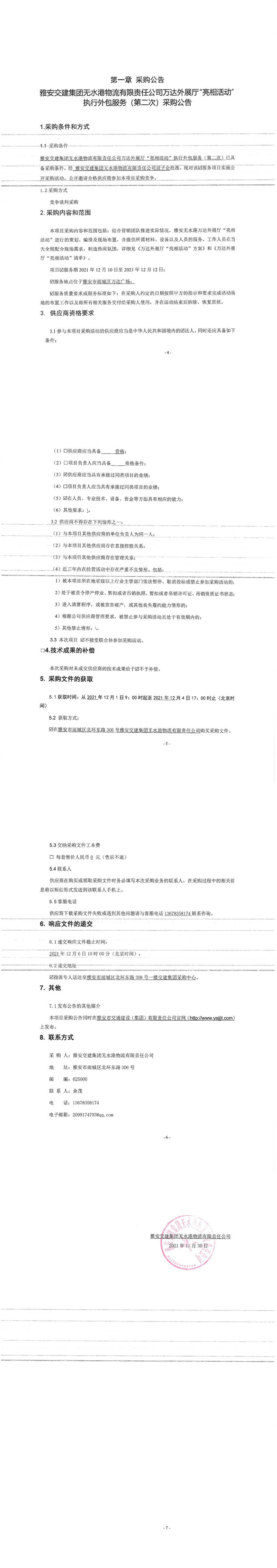 雅安交建集團(tuán)無(wú)水港物流有限責(zé)任公司萬(wàn)達(dá)外展廳“亮相活動(dòng)”執(zhí)行外包服務(wù)(第二次)采購(gòu)公告