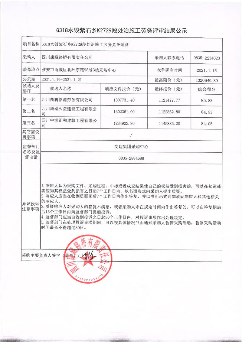 四川康藏路橋有限責(zé)任公司G318水毀紫石鄉(xiāng)K2729段處治施工勞務(wù)評(píng)審結(jié)果公示