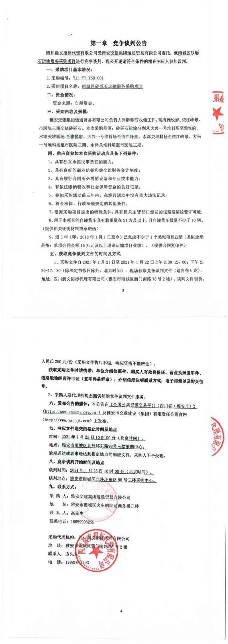雅安交建集團(tuán)運(yùn)通貿(mào)易有限公司雨城區(qū)砂礫石運(yùn)輸服務(wù)采購(gòu)項(xiàng)目競(jìng)爭(zhēng)談判公告
