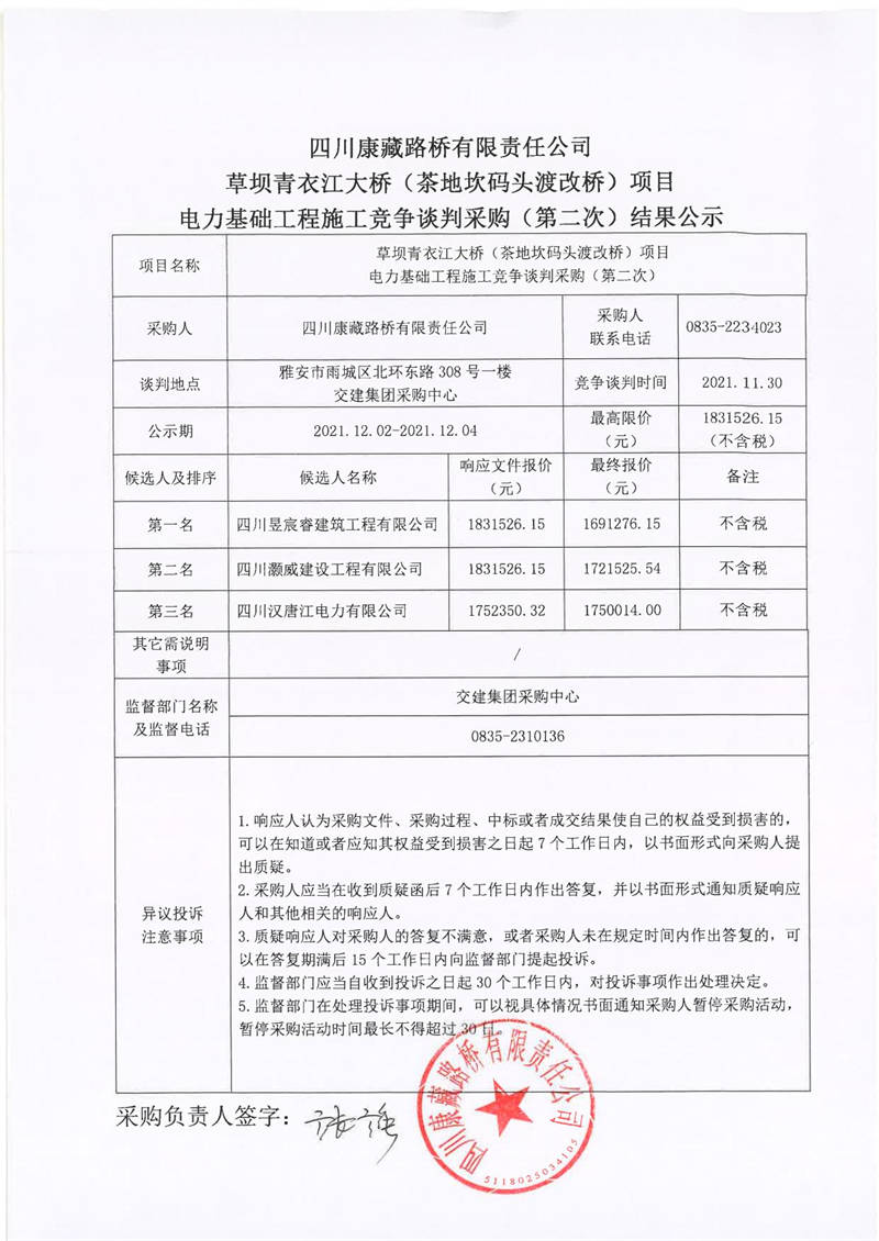 四川康藏路橋有限責(zé)任公司草壩青衣江大橋(茶地坎碼頭渡改橋)項(xiàng)目電力基礎(chǔ)工程施工競爭談判采購(第二次)結(jié)果公示