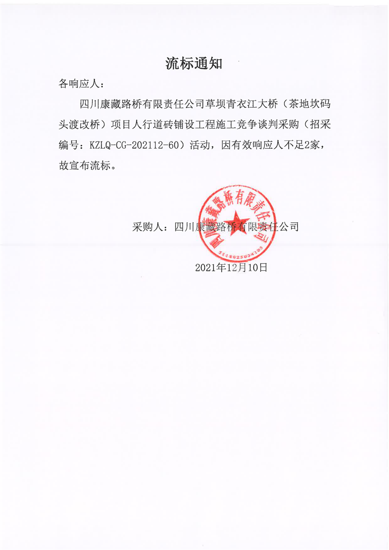 四川康藏路橋有限責(zé)任公司草壩青衣江大橋(茶地坎碼頭渡改橋)項(xiàng)目人行道磚鋪設(shè)工程施工競(jìng)爭(zhēng)談判采購(gòu)流標(biāo)通知