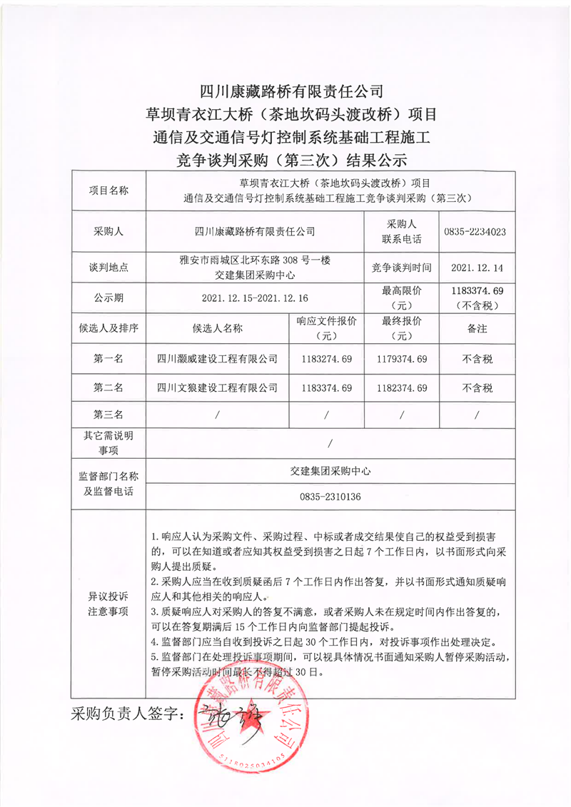 四川康藏路橋有限責任公司草壩青衣江大橋(茶地坎碼頭渡改橋)項目通信及交通信號燈控制系統(tǒng)基礎工程施工競爭談判采購(第三次)結(jié)果公示