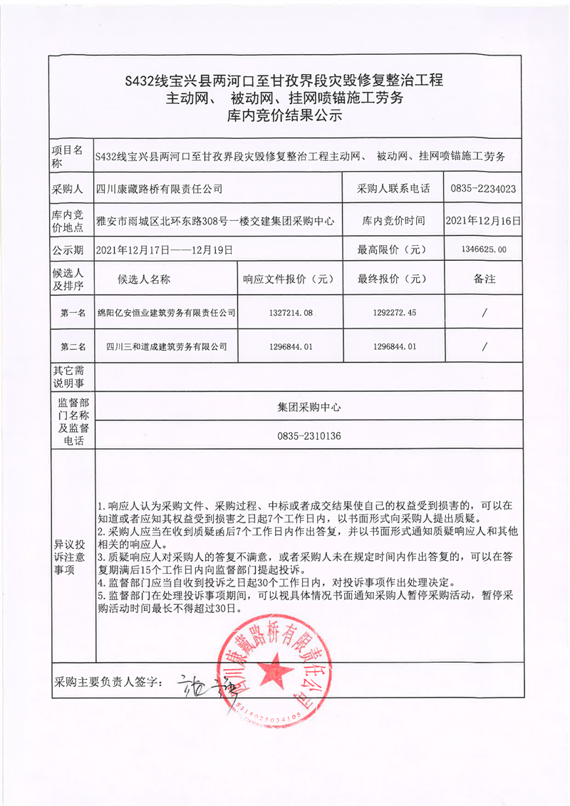 四川康藏路橋有限責(zé)任公司S432線寶興縣兩河口至甘孜界段災(zāi)毀修復(fù)整治工程主動(dòng)網(wǎng)、補(bǔ)動(dòng)網(wǎng)、掛網(wǎng)噴錨施工勞務(wù)庫(kù)內(nèi)競(jìng)價(jià)結(jié)果公示