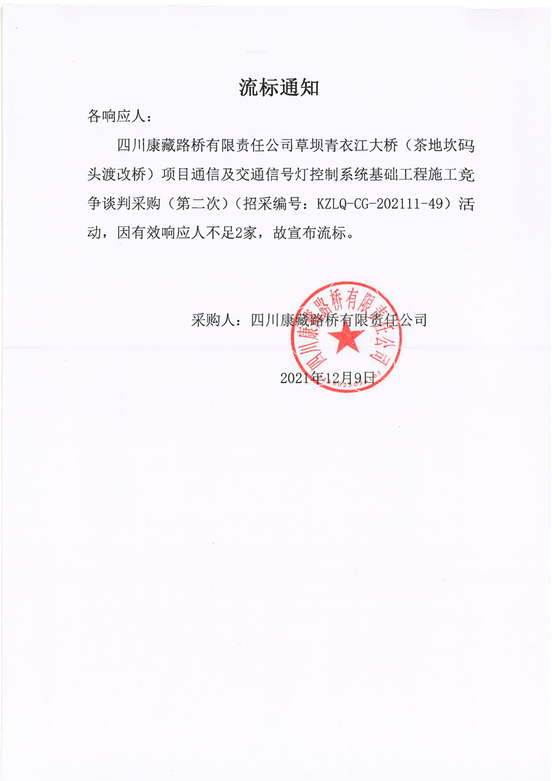 四川康藏路橋有限責(zé)任公司草壩青衣江大橋(茶地坎碼頭渡改橋)項目通信及交通信號燈控制系統(tǒng)基礎(chǔ)工程施工競爭談判采購(第二次)流標(biāo)通知