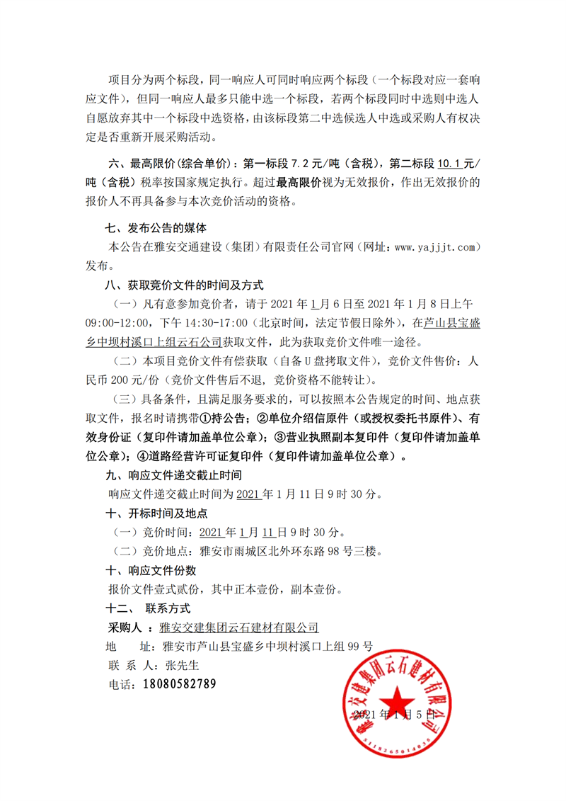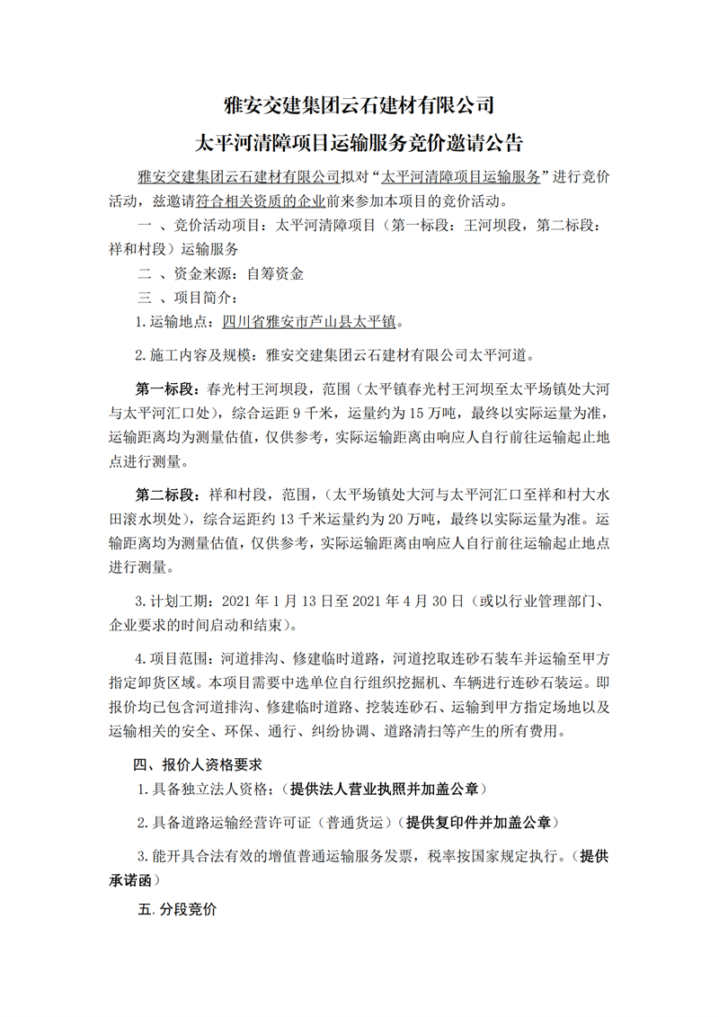 雅安交建集團(tuán)云石建材有限公司太平河清障項(xiàng)目運(yùn)輸服務(wù)競價(jià)邀請公告