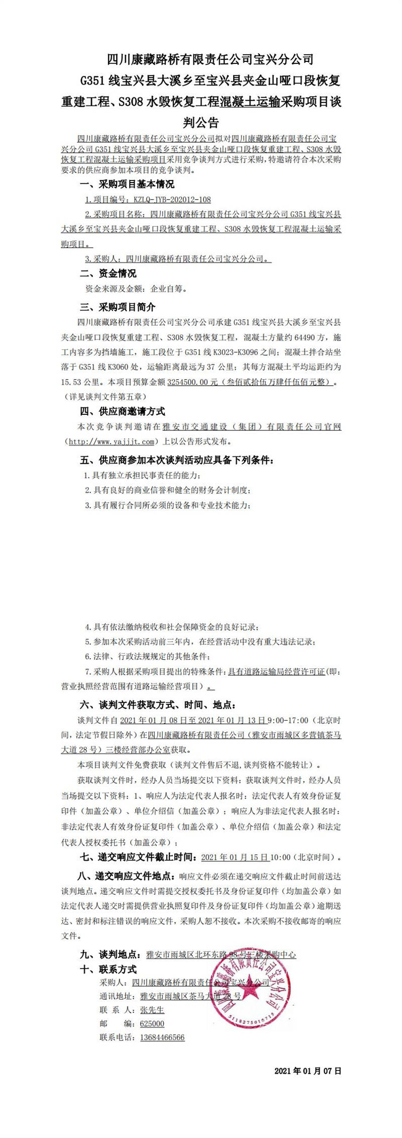 四川康藏路橋有限責(zé)任公司寶興分公司G351線寶興縣大溪鄉(xiāng)至寶興縣夾金山啞口段恢復(fù)重建工程、S308水毀恢復(fù)工程混凝土運輸采購項目談判公告