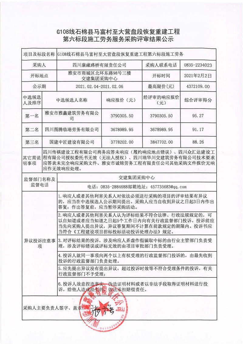 四川康藏路橋有限責任公司G108線石棉縣馬富村至大營盤段恢復重建工程第六標段施工勞務服務采購評審結果公示