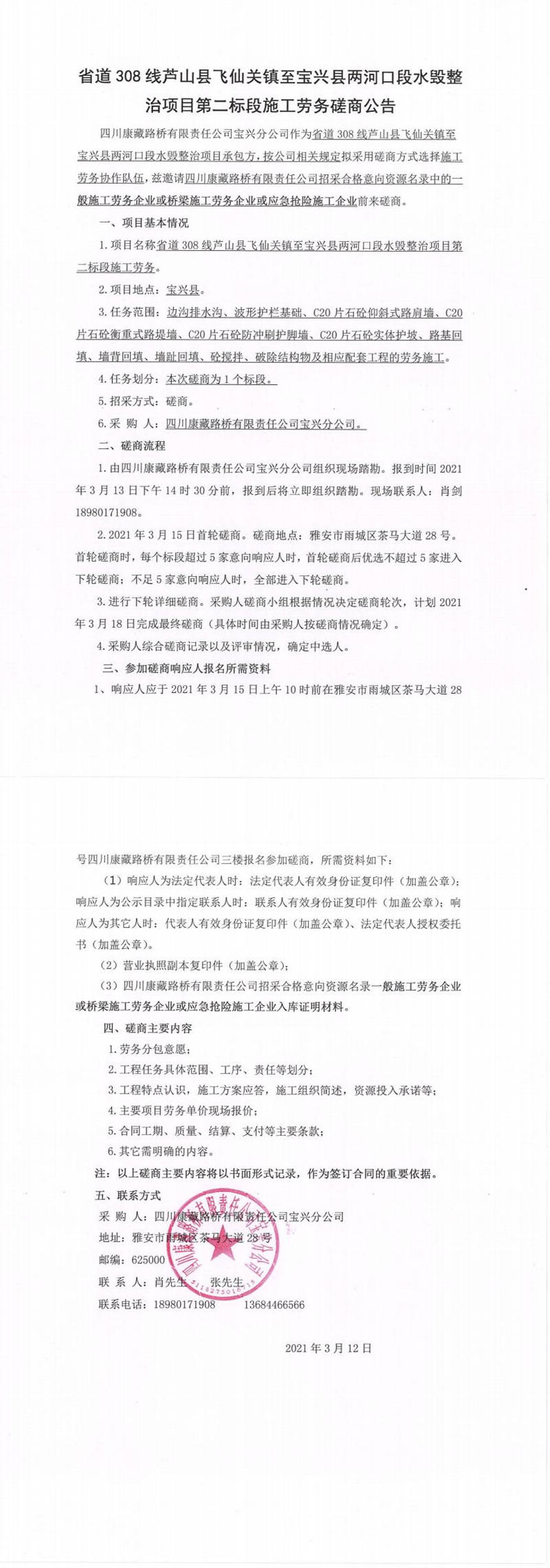 四川康藏路橋有限責(zé)任公司寶興分公司省道308線蘆山縣飛仙關(guān)鎮(zhèn)至寶興縣兩河口段水毀整治項目第二標(biāo)段施工勞務(wù)磋商公告