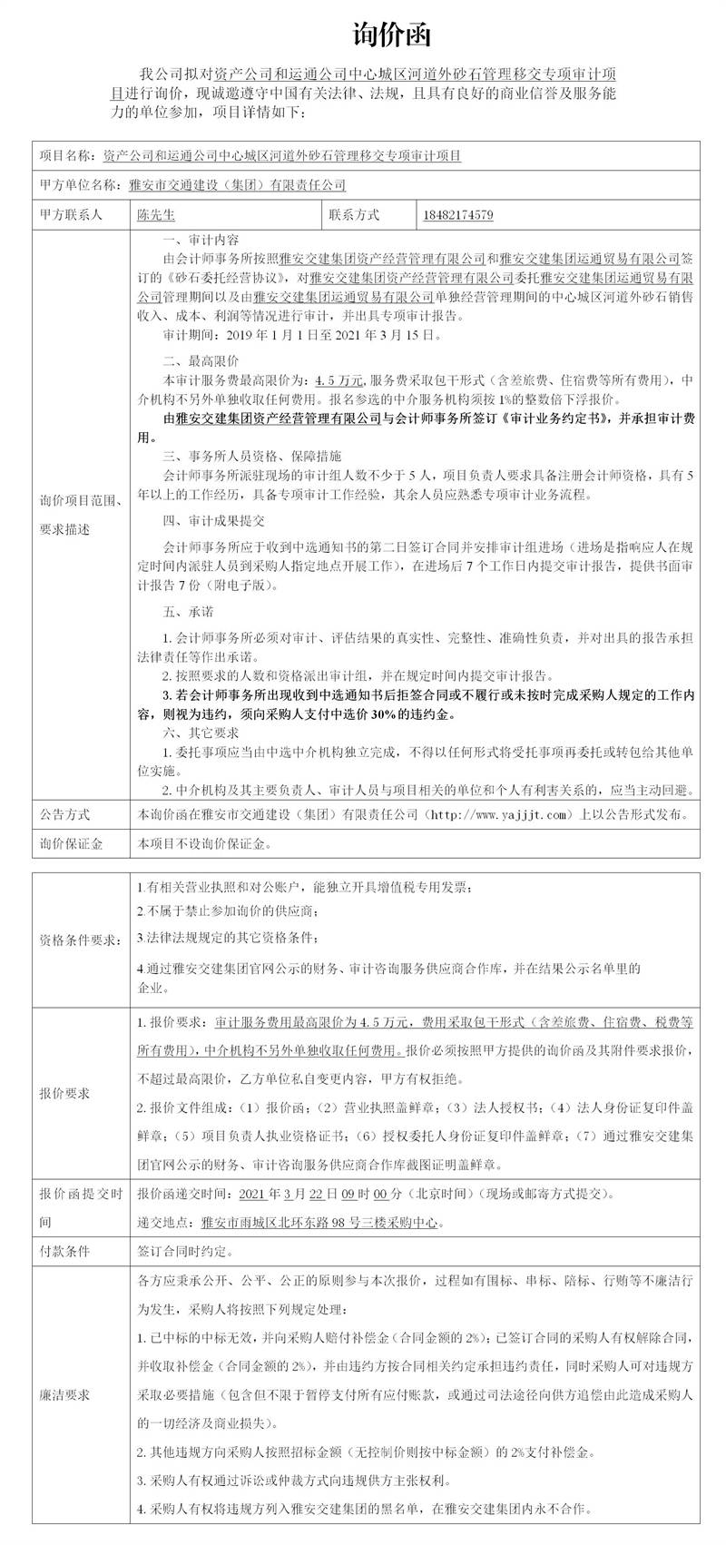 雅安市交通建設(shè)(集團(tuán))有限責(zé)任公司資產(chǎn)公司和運(yùn)通公司中心城區(qū)河道外砂石管理移交專項(xiàng)審計(jì)項(xiàng)目詢價(jià)函