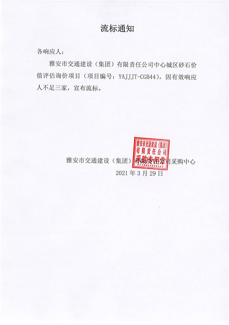 雅安市交通建設(集團)有限責任公司中心城區(qū)砂石價值評估項目流標通知