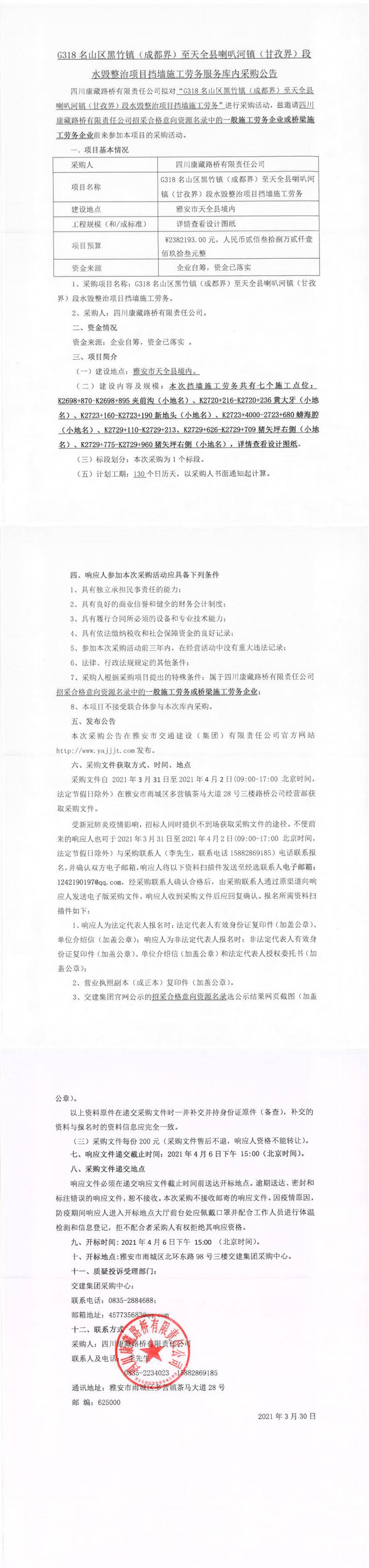 四川康藏路橋有限責(zé)任公司G318名山區(qū)黑竹鎮(zhèn)(成都界)至天全縣喇叭河鎮(zhèn)(甘孜界)段水毀整治項(xiàng)目擋墻施工勞務(wù)服務(wù)庫內(nèi)采購(gòu)公告