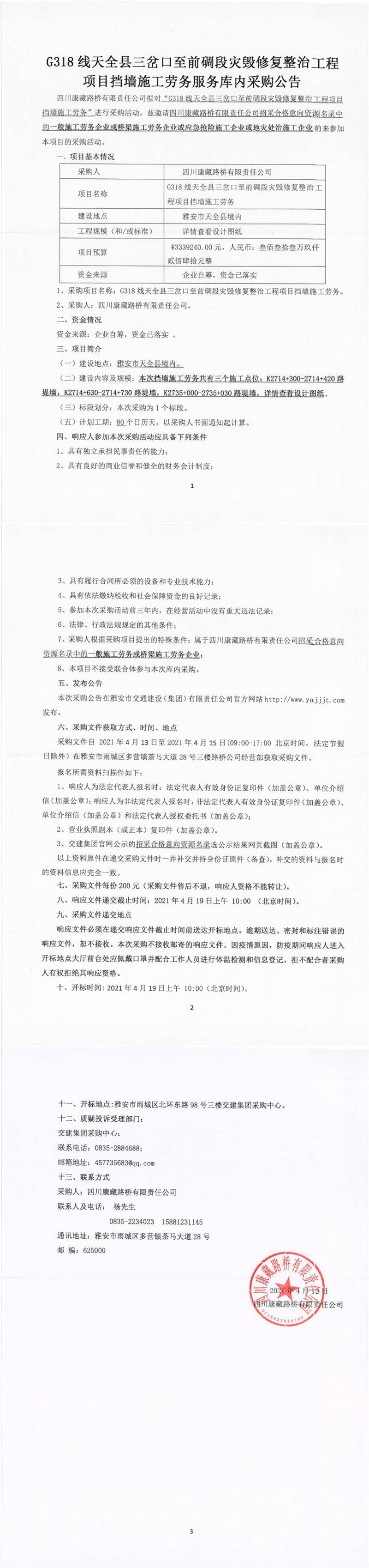 四川康藏路橋有限責任公司G318線天全縣三岔口至前碉段災(zāi)毀修復(fù)整治工程項目擋墻施工勞務(wù)服務(wù)庫內(nèi)采購公告