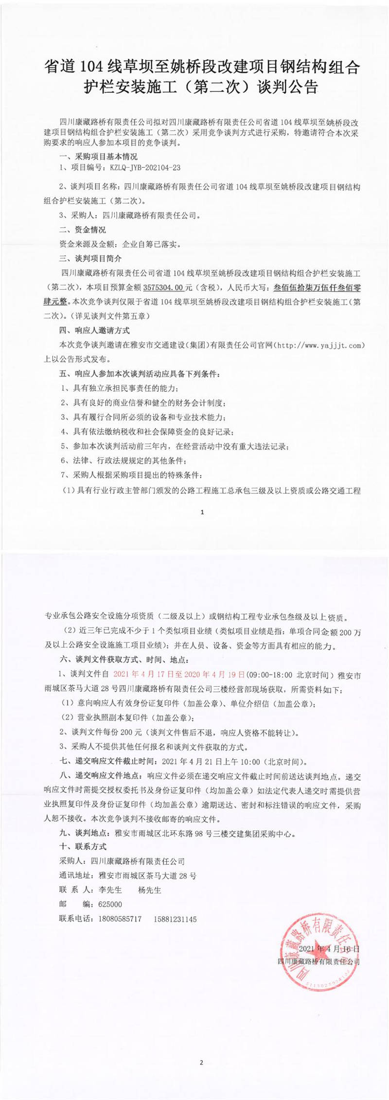四川康藏路橋有限責任公司省道104線草壩至姚橋段改建項目鋼結(jié)構(gòu)組合護欄安裝施工(第二次)談判公告