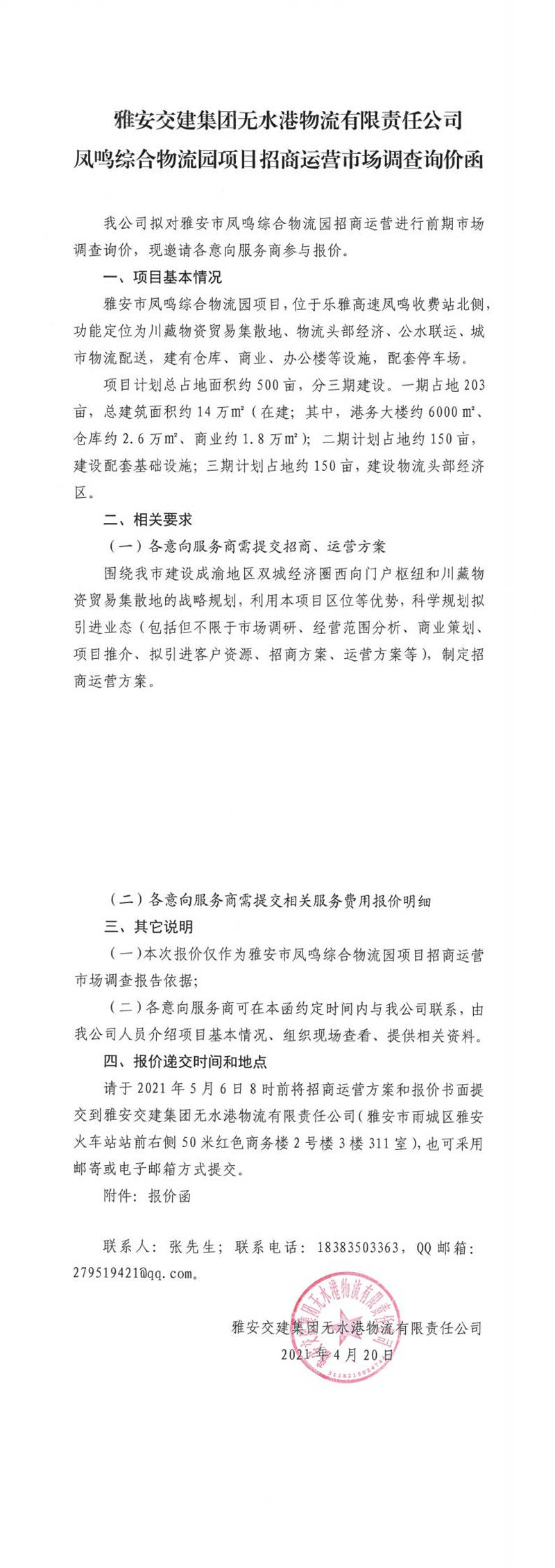 雅安交建集團(tuán)無(wú)水港物流有限責(zé)任公司鳳鳴綜合物流園項(xiàng)目招商運(yùn)營(yíng)市場(chǎng)調(diào)查詢價(jià)函