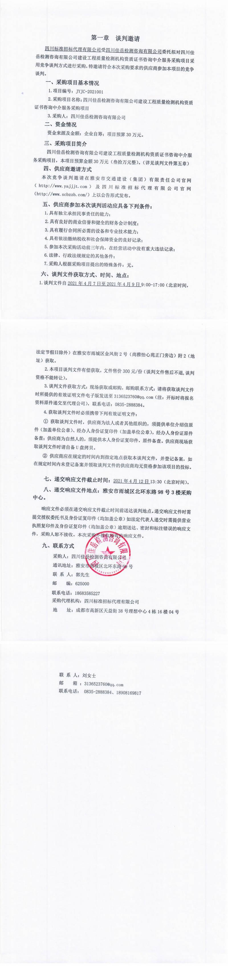 四川佳岳檢測咨詢有限公司建設(shè)工程質(zhì)量檢測機構(gòu)資質(zhì)證書咨詢中介服務(wù)采購項目競爭談判公告