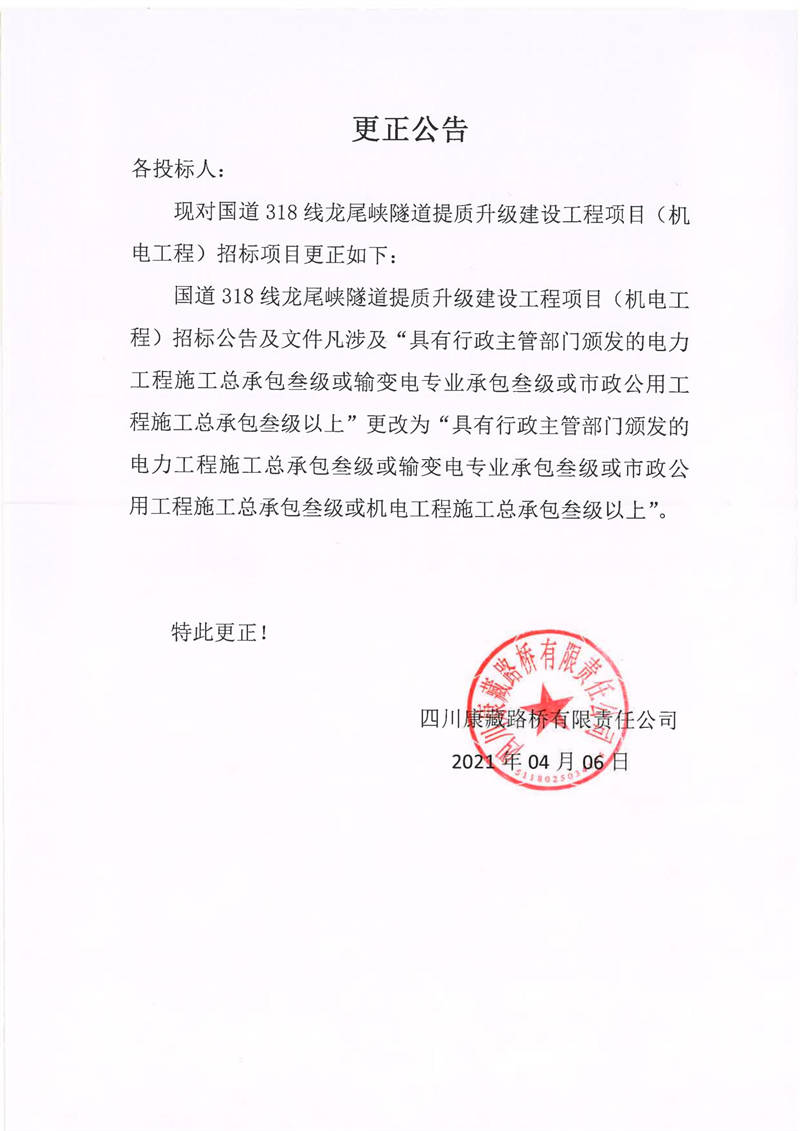 四川康藏路橋有限責(zé)任公司國道318線龍尾峽隧道提質(zhì)升級建設(shè)工程項目(機(jī)電工程)更正公告