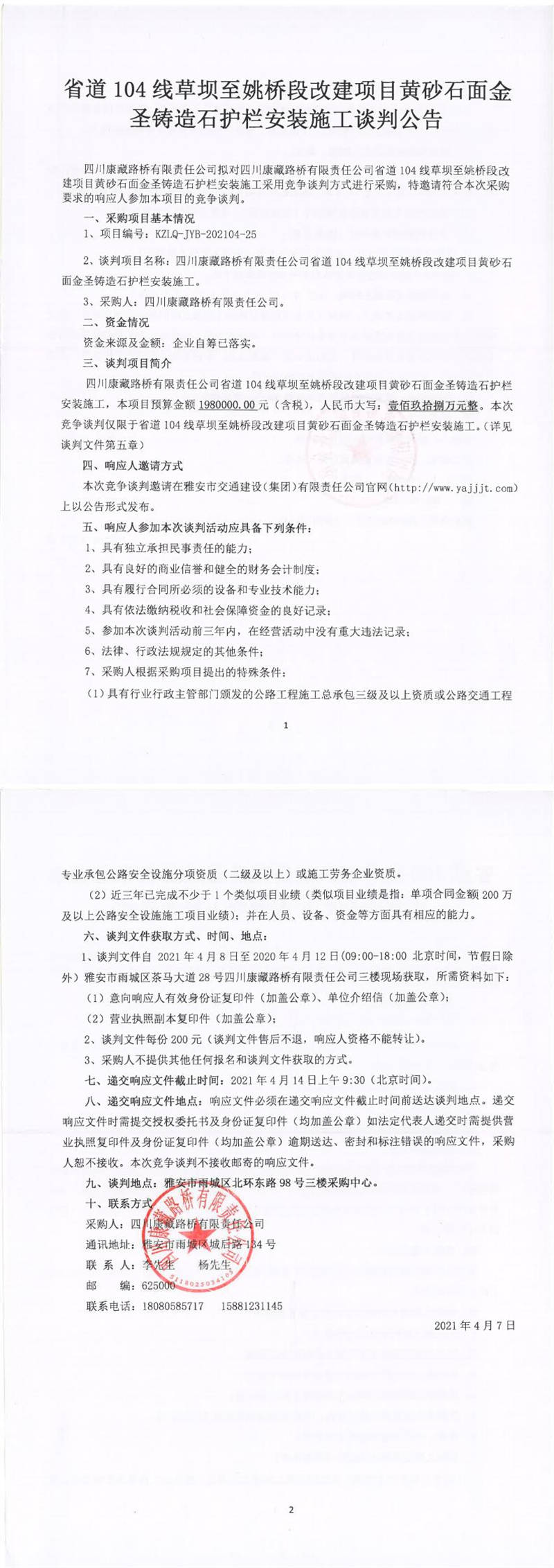 四川康藏路橋有限責任公司省道104線草壩至姚橋段改建項目黃砂石面金圣鑄造石護欄安裝施工談判公告