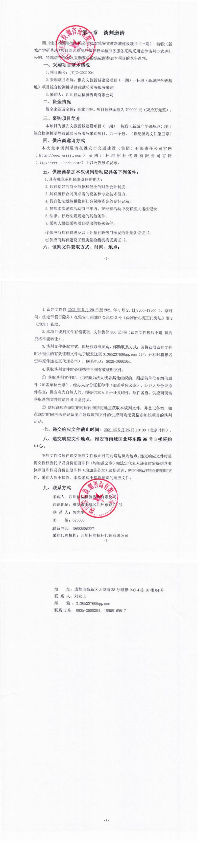 四川佳岳檢測咨詢有限公司雅安文教新城建設(shè)項目(一期)一標(biāo)段(新城產(chǎn)學(xué)研基地)項目綜合檢測樁基靜載試驗勞務(wù)服務(wù)競爭談判公告