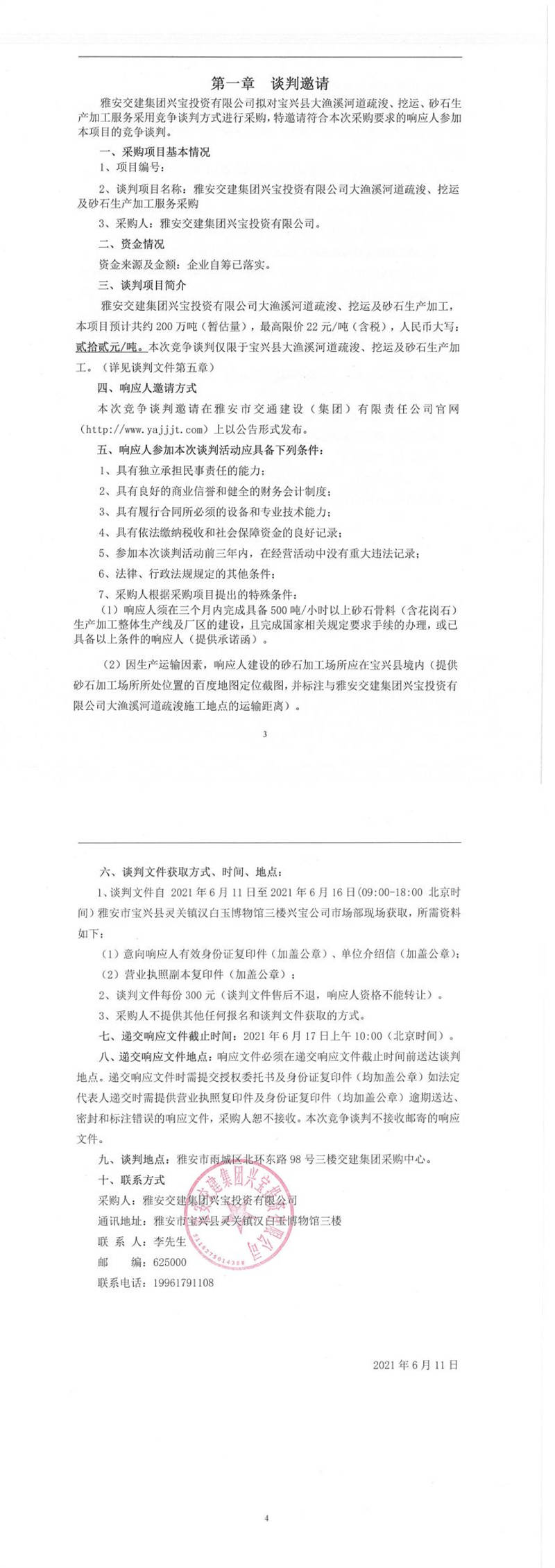 雅安交建集團興寶投資有限公司大漁溪河道疏浚、挖運及砂石生產(chǎn)加工服務(wù)采購競爭談判公告