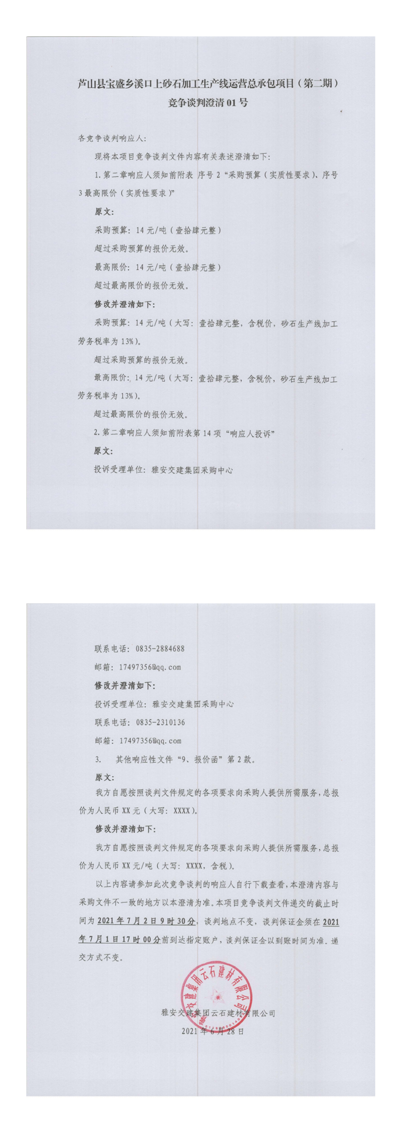 雅安交建集團(tuán)云石建材有限公司蘆山縣寶盛鄉(xiāng)溪口上砂石加工生產(chǎn)線運(yùn)營總承包項目(第二期)競爭談判澄清公告