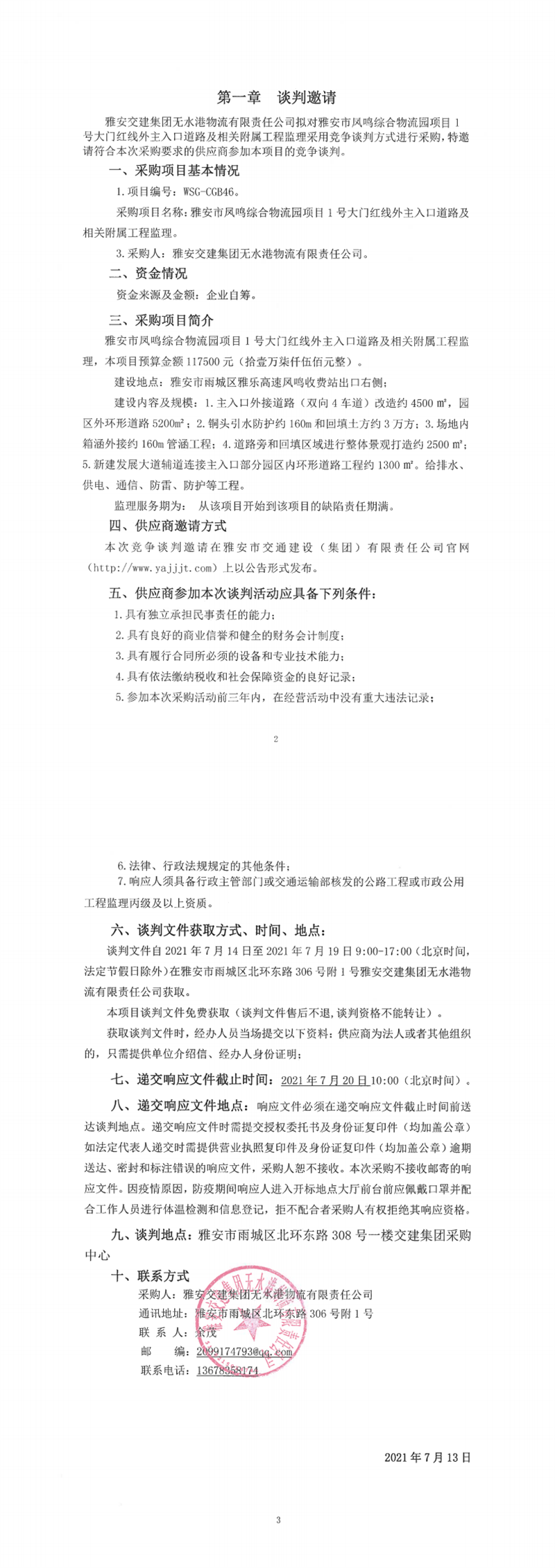 雅安交建集團(tuán)無水港物流有限責(zé)任公司雅安市鳳鳴綜合物流園項(xiàng)目1號大門紅線外主入口道路及相關(guān)附屬工程監(jiān)理競爭談判公告