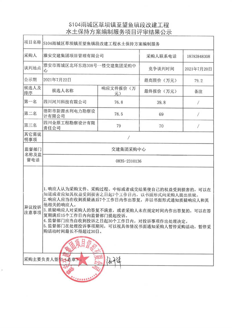 雅安交建集團(tuán)項(xiàng)目管理有限公司S104雨城區(qū)草壩鎮(zhèn)至望魚鎮(zhèn)段改建工程水土保持方案編制服務(wù)項(xiàng)目評審結(jié)果公示