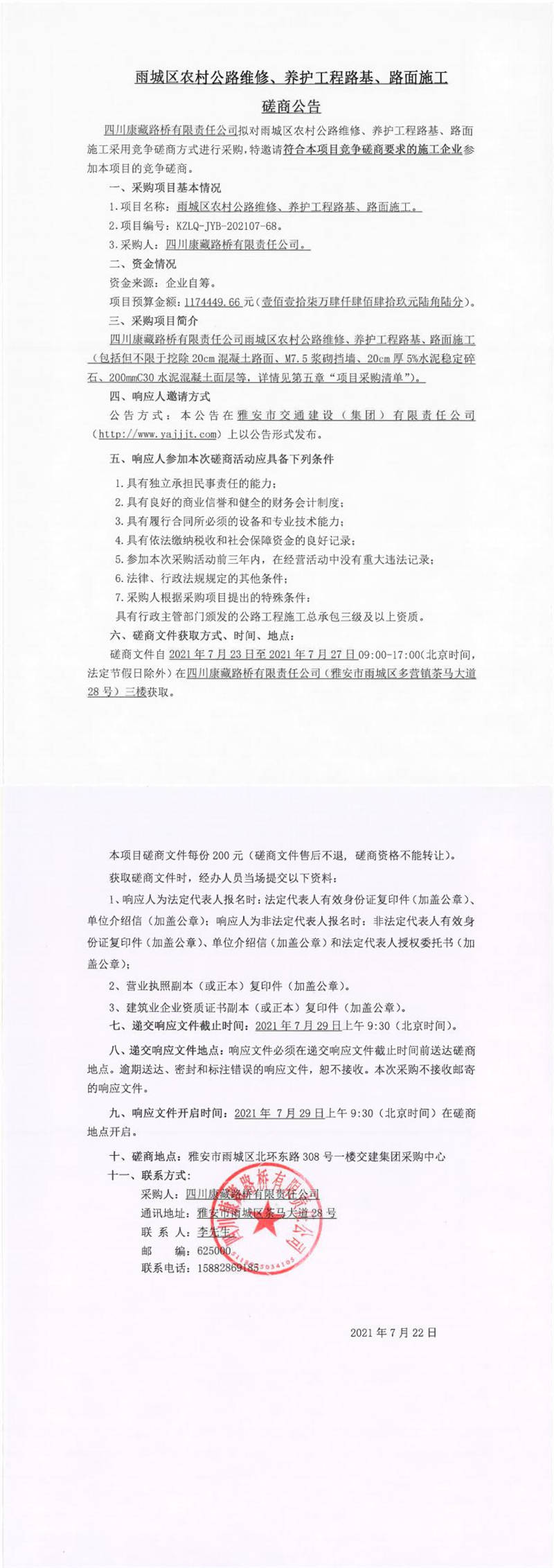 四川康藏路橋有限責(zé)任公司雨城區(qū)農(nóng)村公路維修、養(yǎng)護(hù)工程路基、路面施工磋商公告