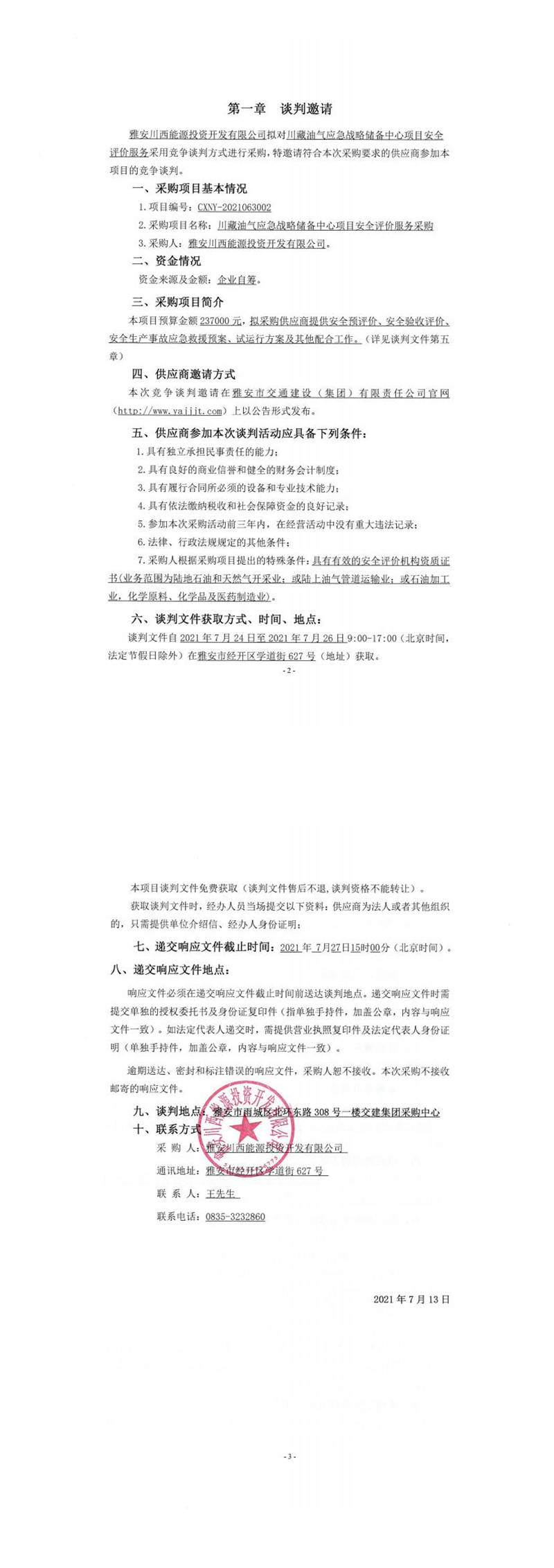 雅安川西能源投資開發(fā)有限公司川藏油氣應(yīng)急戰(zhàn)略儲備中心項(xiàng)目安全評價(jià)服務(wù)采購競爭談判公告
