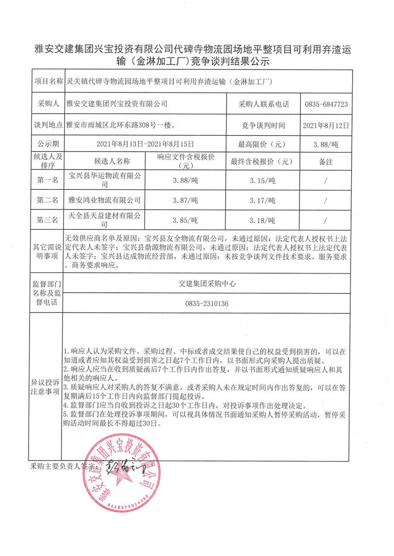 雅安交建集團興寶投資有限公司代碑寺物流園場地平整項目可利用棄渣運輸(金淋加工廠)競爭談判結果公示