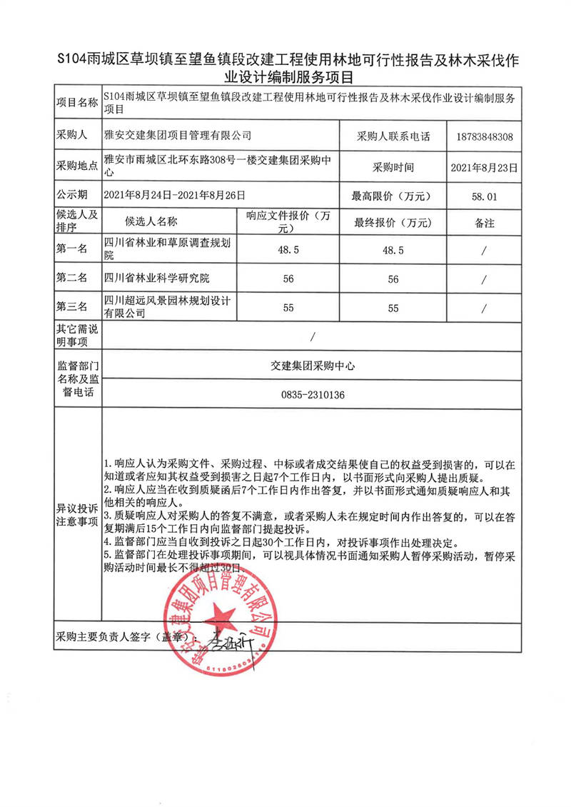 雅安交建集團項目管理有限公司S104雨城區(qū)草壩鎮(zhèn)至望魚鎮(zhèn)段改建工程使用林地可行性報告及林木采伐作業(yè)設(shè)計編制服務(wù)項目評審結(jié)果公示