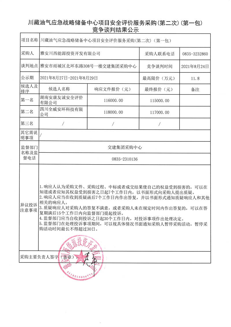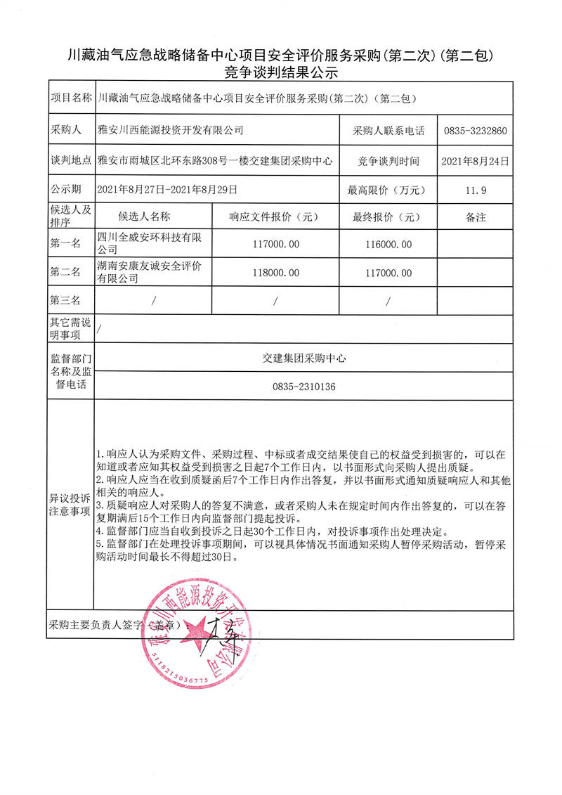 川藏油氣應(yīng)急戰(zhàn)略儲備中心項目安全評價服務(wù)采購(第二次)(第一包、第二包)競爭談判結(jié)果公示