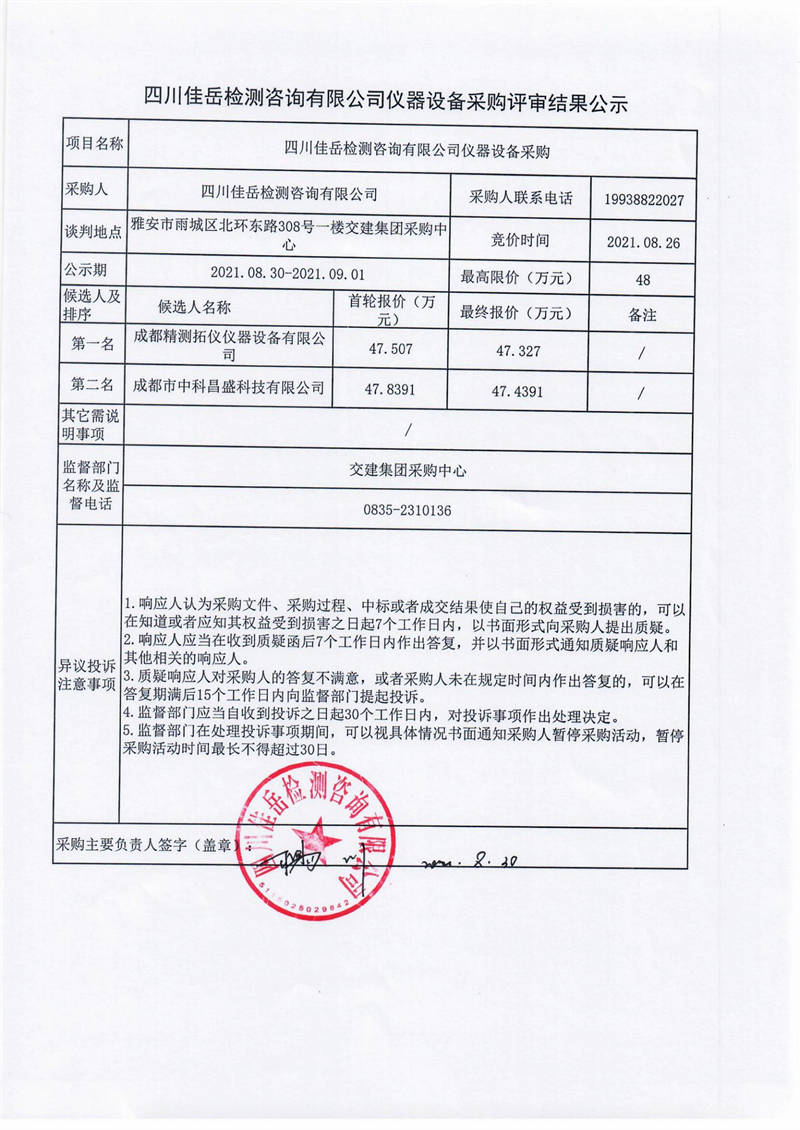 四川佳岳檢測咨詢有限公司儀器設備采購評審結果公示