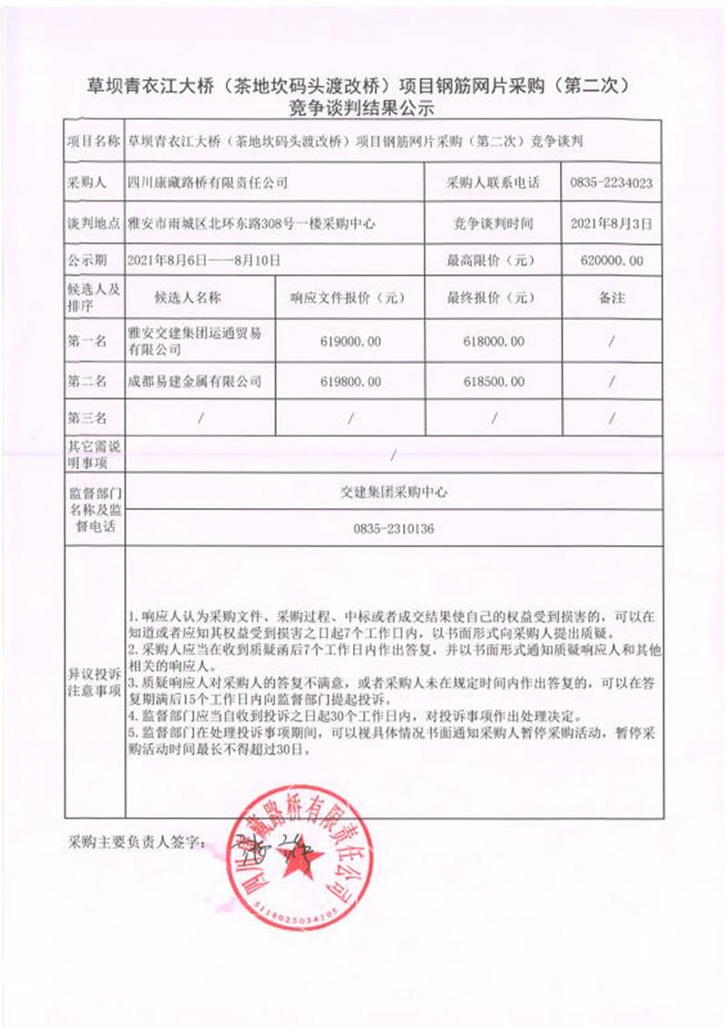 四川康藏路橋有限責(zé)任公司草壩青衣江(茶地坎碼頭渡改橋)項目鋼筋片采購競爭談判結(jié)果公示