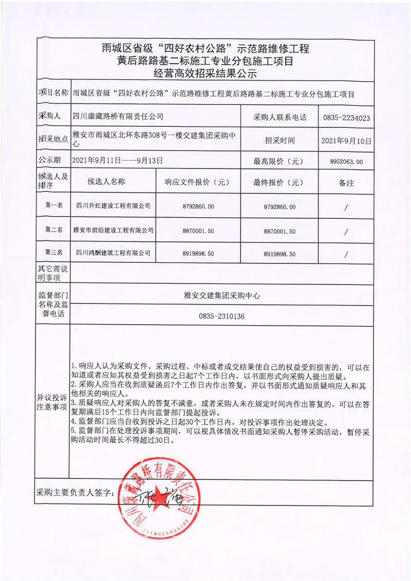 四川康藏路橋有限責(zé)任公司雨城區(qū)省級(jí)“四好農(nóng)村公路”示范路維修工程黃后路路基二標(biāo)施工專業(yè)分包施工項(xiàng)目經(jīng)營(yíng)高效招采結(jié)果公示
