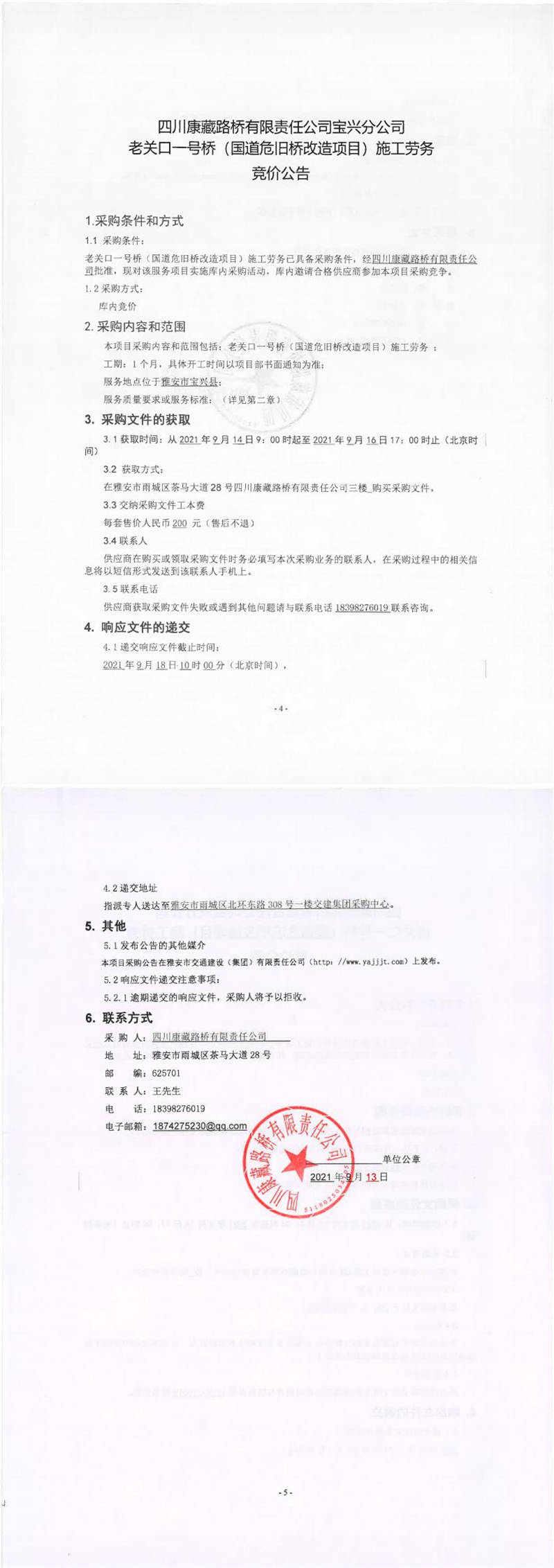 四川康藏路橋有限責(zé)任公司寶興分公司老關(guān)口一號(hào)橋(國(guó)道危舊橋改造項(xiàng)目)施工勞務(wù)競(jìng)價(jià)公告