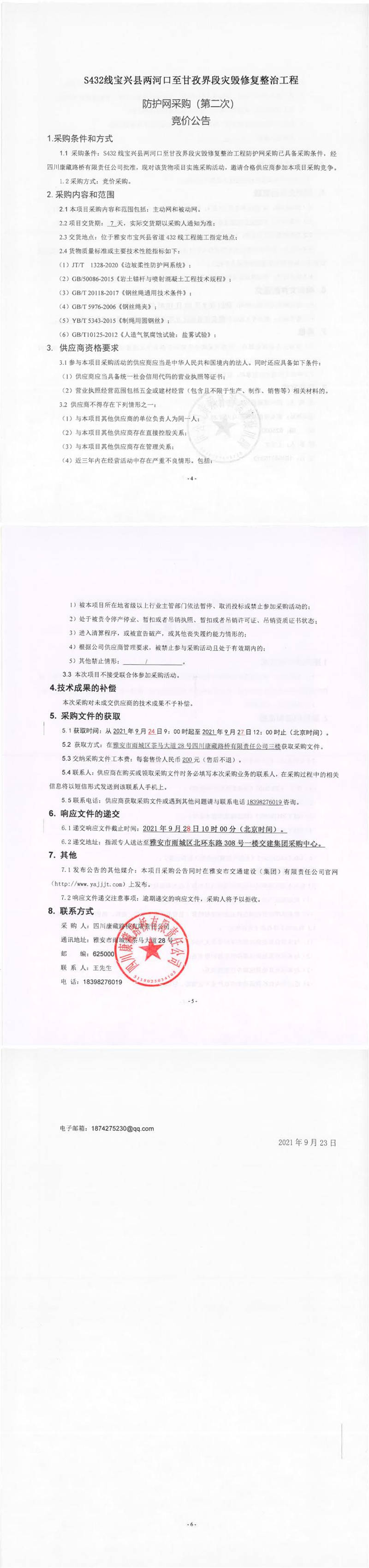 四川康藏路橋有限責任公司S432線寶興縣兩河口至甘孜界段災毀修復整治工程防護網(wǎng)采購(第二次)競價公告