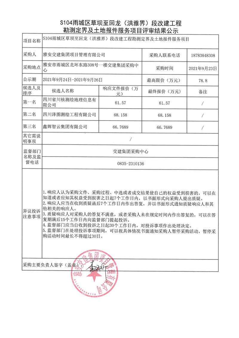 雅安交建集團項目管理有限公司S104雨城區(qū)草壩至回龍(洪雅界)段改建工程勘測定界及土地報件服務(wù)項目評審結(jié)果公示