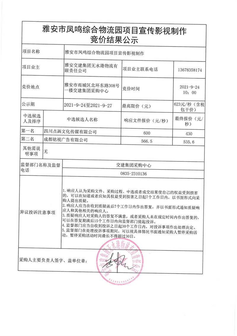 雅安交建集團無水港物流有限責(zé)任公司雅安市鳳鳴綜合物流園項目宣傳影視制作競價結(jié)果公示