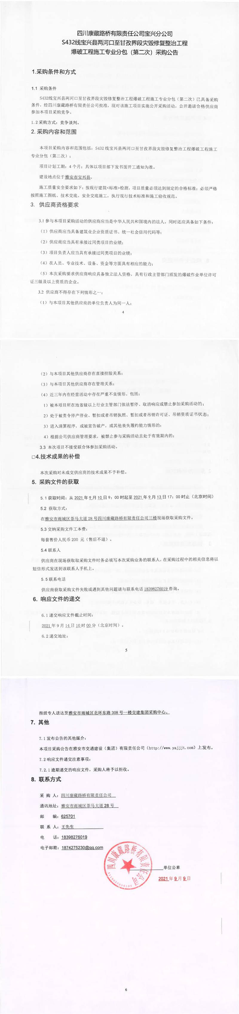 四川康藏路橋有限責(zé)任公司S432線寶興縣兩河口至甘孜界段災(zāi)毀修復(fù)整治工程爆破工程施工專(zhuān)業(yè)分包(第二次)采購(gòu)公告