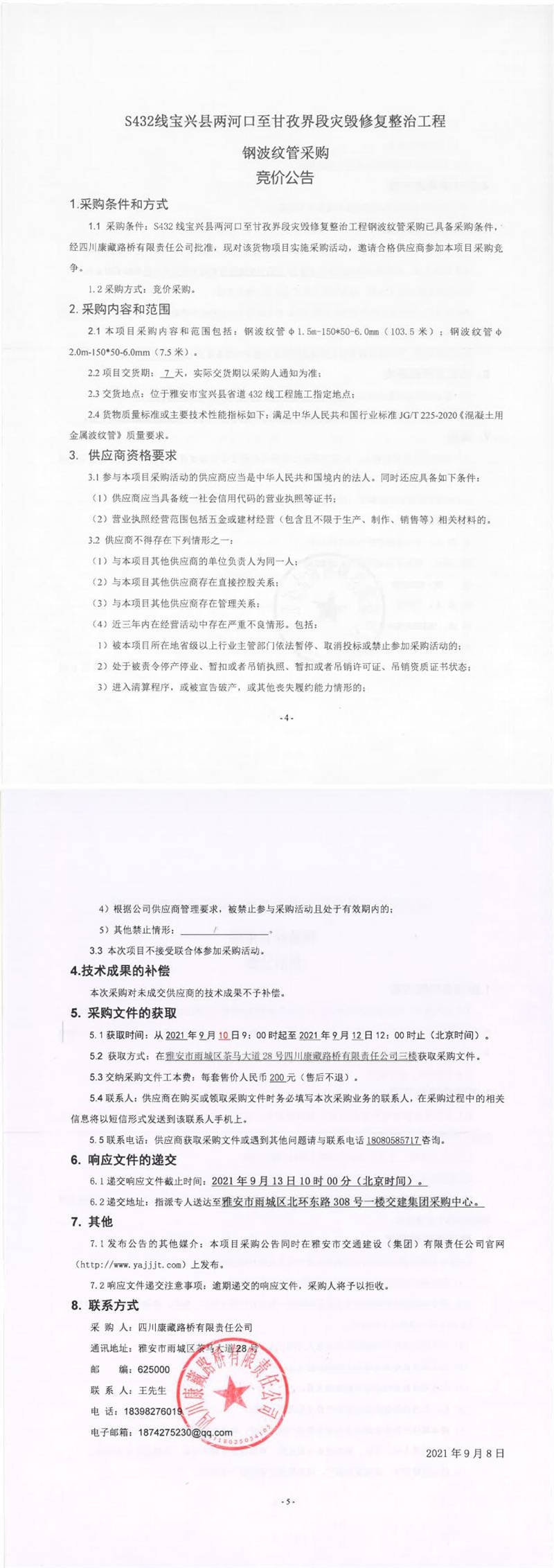 四川康藏路橋有限責(zé)任公司S432線寶興縣兩河口至甘孜界段災(zāi)毀修復(fù)整治工程鋼波紋管采購競價公告