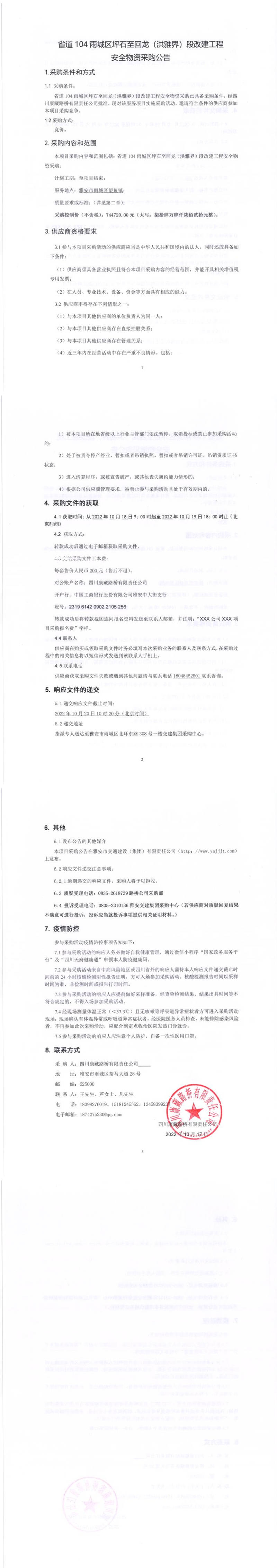 四川康藏路橋有限責任公司省道104雨城區(qū)坪石至回龍(洪雅界)段改建工程項目安全物資采購公告