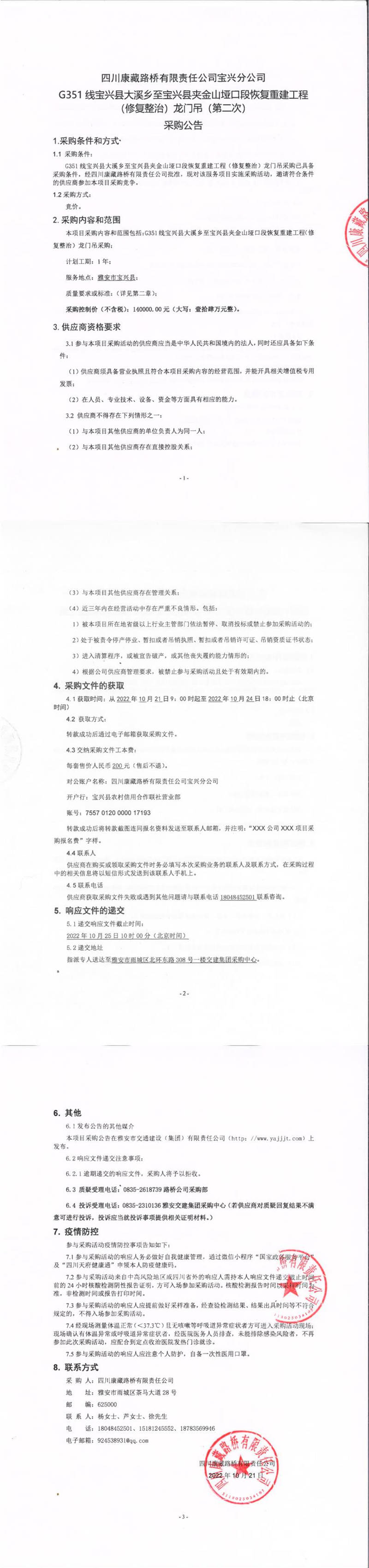 四川康藏路橋有限責(zé)任公司寶興分公司G351線寶興縣大溪鄉(xiāng)至寶興縣夾金山埡口段恢復(fù)重建工程(修復(fù)整治)龍門吊(第二次)采購(gòu)公告