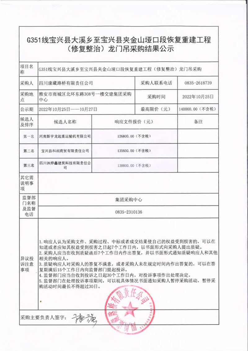 四川康藏路橋有限責(zé)任公司G351線寶興縣大溪鄉(xiāng)至寶興縣夾金山埡口段恢復(fù)重建工程(修復(fù)整治)龍門吊采購結(jié)果公示