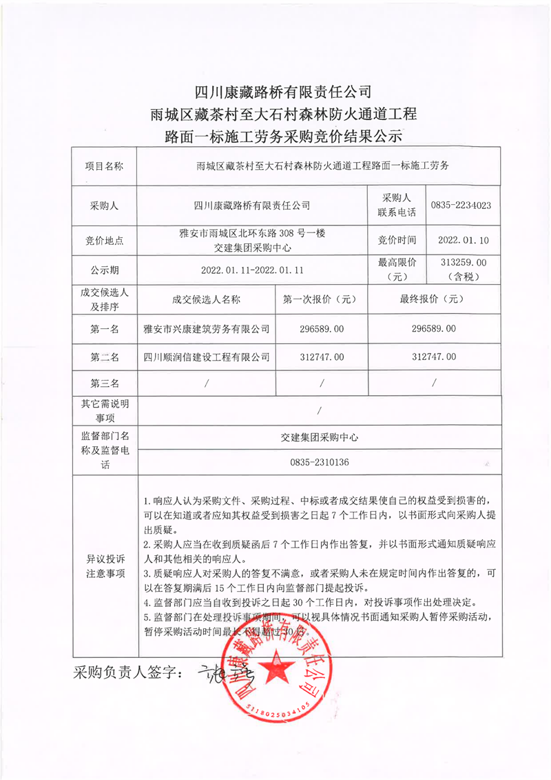 四川康藏路橋有限責(zé)任公司雨城區(qū)藏茶村至大石村森林防火通道工程路面一標(biāo)施工勞務(wù)采購(gòu)競(jìng)價(jià)結(jié)果公示